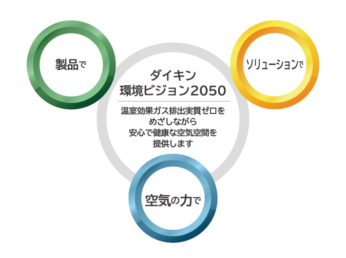 ダイキングループは、「環境ビジョン2050」に基づき、2019年比で2050年にGHG(温室効果ガス)排出ネットゼロをめざしています。これに向けて、法規制の改正のタイミングを捉えた情報の提供や、新冷媒への転換、高効率な省エネ空調への転換などのレトロフィットをご提案。製品のライフサイクルに合わせた排出削減に取り組んでいます。
